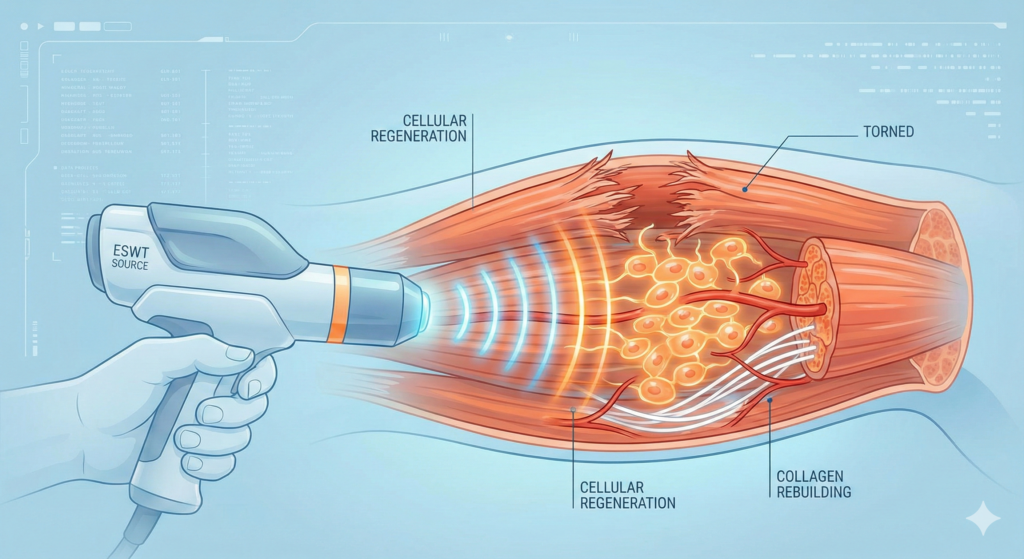 일반적으로 3회의 치료 정도면 손상이 회복됩니다. - 체외충격파 치료 (ESWT): 손상 부위의 미세 순환을 획기적으로 개선하고 신생 혈관 형성을 유도하여 근육 치유 속도를 높이는 대표적인 비수술 치료입니다.