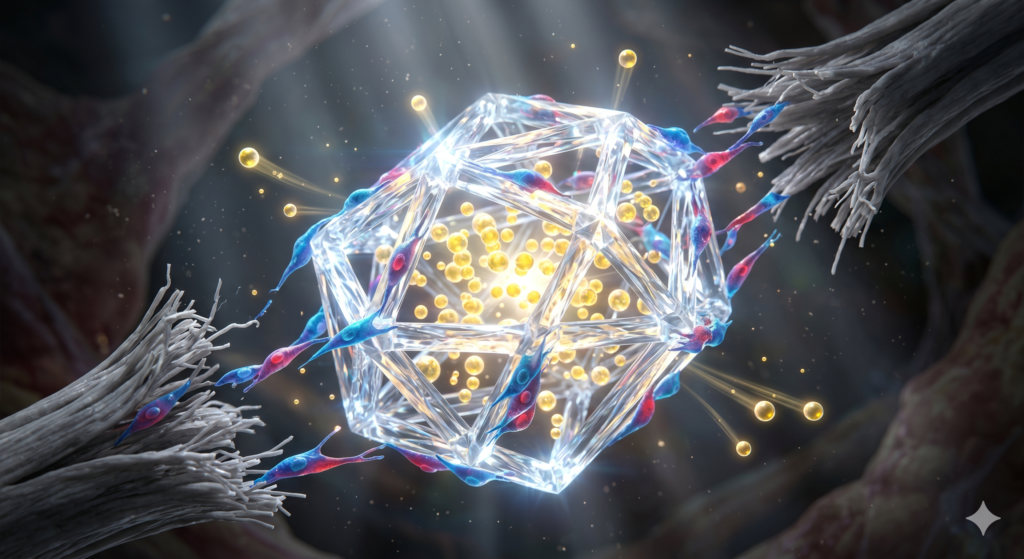 - 생체 비계(Scaffold) 형성: 건물을 지을 때 철근을 세우듯, 찢어진 힘줄 부위에 주변 세포들이 이동해 붙어 자랄 수 있는 튼튼한 거푸집을 만듭니다.